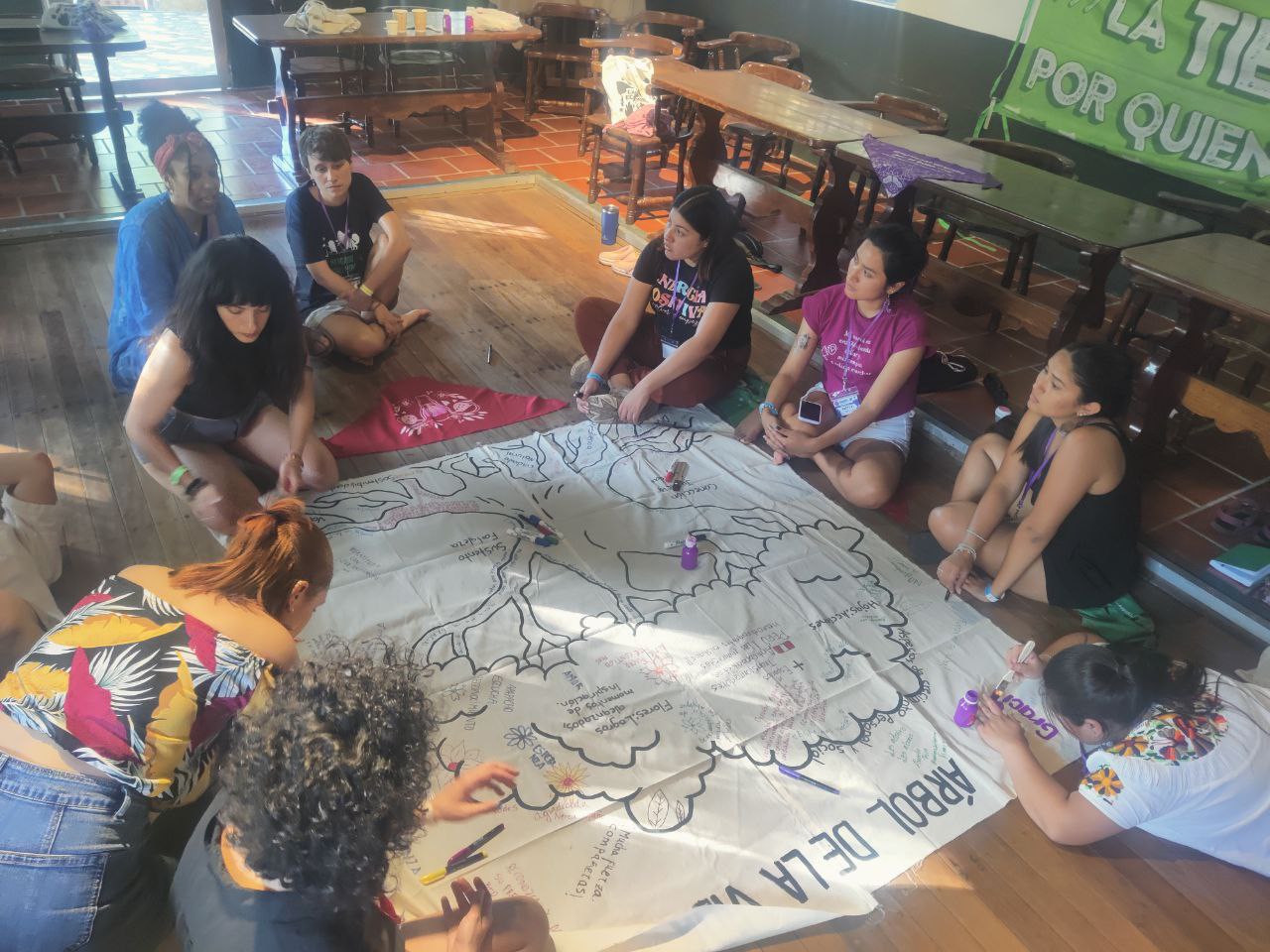 Hoy comenzaron las sesiones de los ejes temáticos en el campamento. A partir de hoy dedicaremos tres días a poner en común las distintas resistencias en la defensa de los territorios de Latinoamérica y Caribe, compartiremos estrategias para transformar narrativas y opresiones y seguiremos trabajando en el autocuidado y los cuidados colectivos y comunitarios.