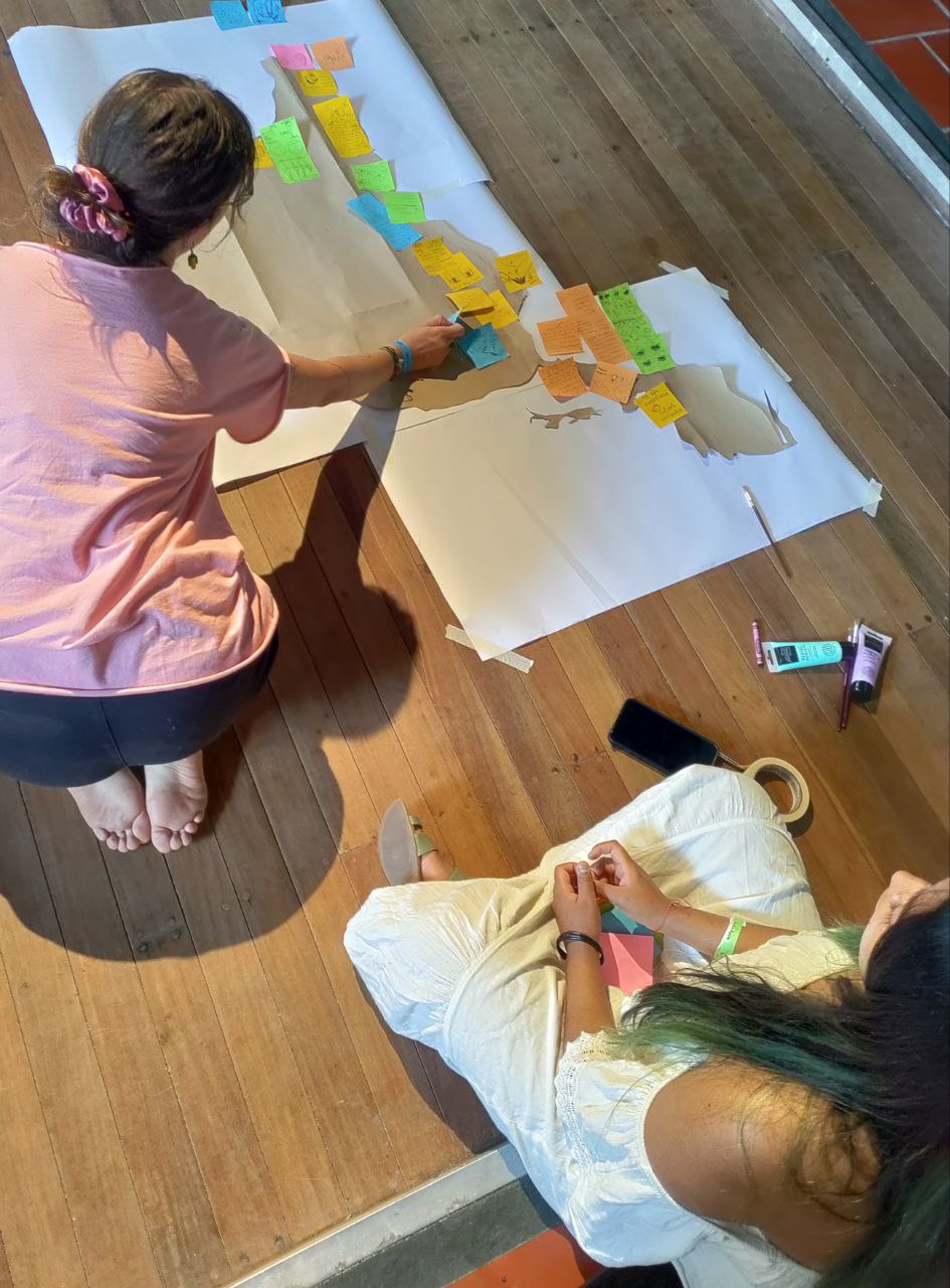 Continuamos observando el trabajo de las compañeras para componer el mapa cuerpa-territoria de Latinoamérica y Caribe, escuchando atentas para saber y no repetir todo lo que en nuestras latitudes se fomenta. Aprendimos que muchas comunidades están resistiendo a campos eólicos, a proyectos de Hidrógeno “verde”, a agroindustrias poderosas y a minerías para sostener las digitalizaciones del Norte Global.